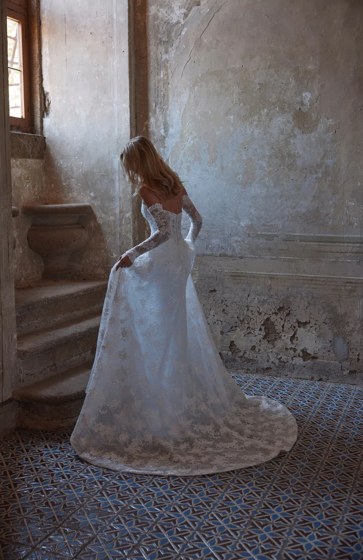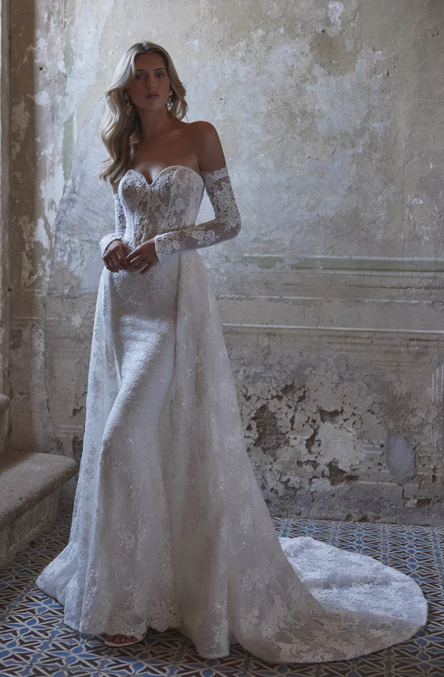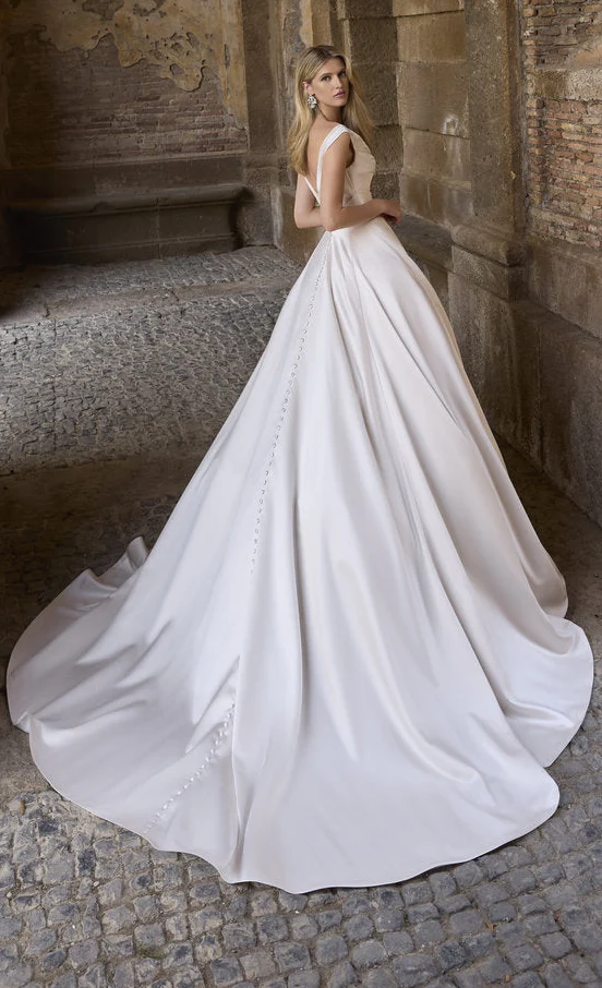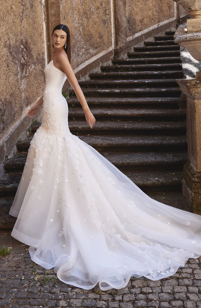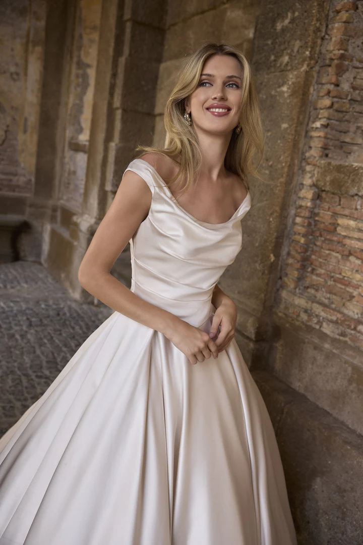 a stunning ballgown wedding dress featuring a beautifully structured bodice that enhances the silhouette with effortless grace. The strapless neckline adds a modern, feminine touch, while the full pleated skirt creates a dramatic yet exquisitely refined presence. Perfect for the bride who seeks classic luxury with contemporary poise, this design promises an unforgettable entrance.